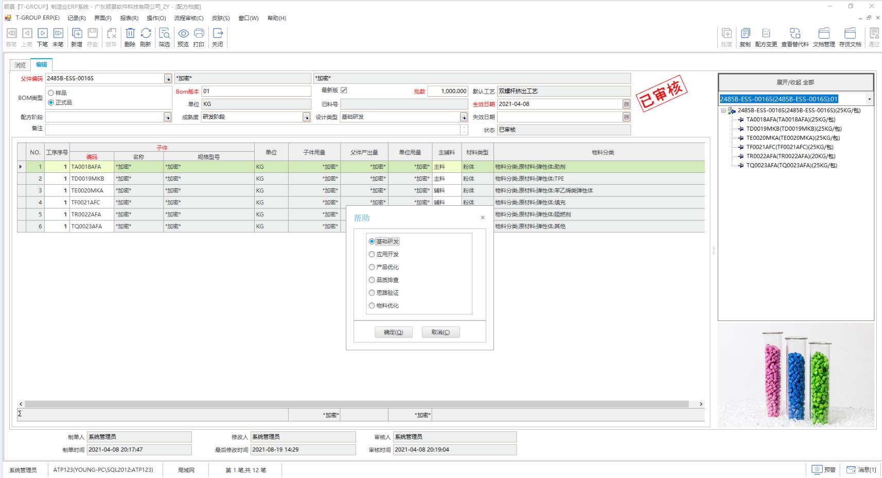 顺景S9 ERP对于改性塑料工厂的配方研发过程进行了全程管理,从发起配方,到参与实验的配方,配方轮次、优选配方、终审配方,以及制样工艺、试片工艺、测试套餐,都进行了记录和管理,这为研发部门提供了详尽的研发履历查询,并累积形成研发配方库、生产工艺库。